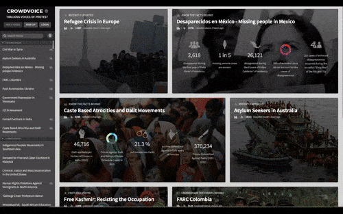 In addition to traceable archives of photos, articles, and videos, CrowdVoice is host to many educational resources like interactive timelines and infographics to promote both at-a-glance and in-depth understanding of the complexities surrounding a wide range of topics.